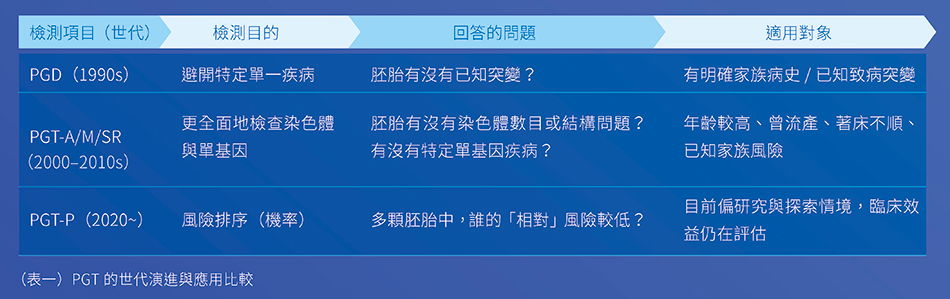 表一統整了 PGT 的演進:早期多以 PGD 泛稱植入前的「特定風險」檢測(多見於家族已知致病突變/單基因疾病);後來逐步細分為 PGT-A(非整倍體)/PGT-M(單基因)/PGT-SR(結構重排);而近年的 PGT-P 則嘗試以多基因疾病的「相對風險(PRS)」做胚胎挑選的排序。
