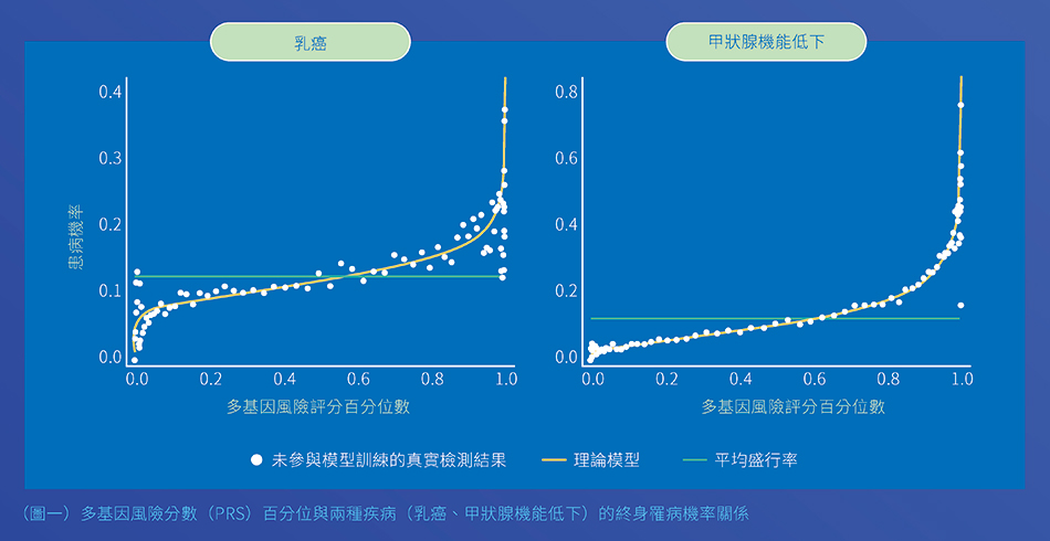 2021 年發表在《Genes》期刊上的一項研究1,顯示PRS 越高者,發病機率確實較高;反之,PRS 低者風險顯著下降。用乳癌、甲狀腺機能低下兩種疾病做範例,強調 PRS 可區分族群內高低風險個體(圖一)。