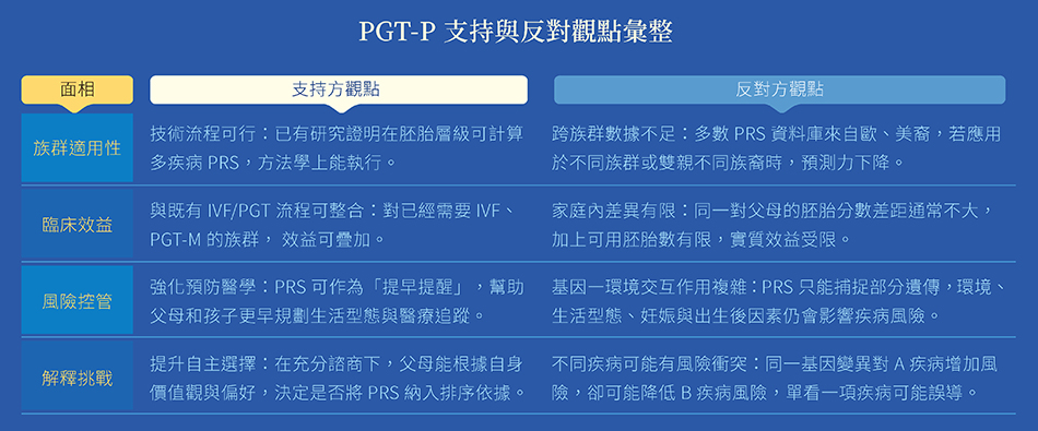 - PGT-P 與既有的 PGT-A/M/SR(非整倍體、單基因、結構重排)性質不同:後者多屬高風險、可明確診斷的遺傳異常。
