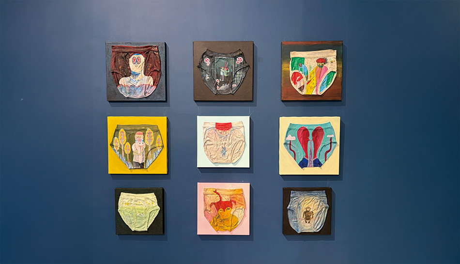 川平遼佑將這樣的身體記憶轉化為創作的媒介,內褲成為承載記憶的畫布,尿液作為夢境留下痕跡的隱喻。他開始以顏料在內褲上進行創作,將童年的恐懼與想像轉譯為可被觀看、感受的圖像。當觀者在凝視這些作品時,既能感受到兒時的不安,也能察覺那種幽默而奇特的生命力。