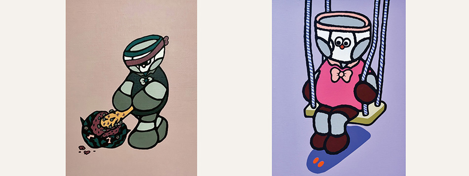 在創作過程中,川平遼佑始終將畫中的角色視為具有獨立意識的存在。角色不只是被描繪的形象,更像是在創作中與他對話、引導作品走向的共創者。然而,大約五年前,他察覺角色逐漸失去回應,創作也隨之陷入停滯。恰巧在那段時間,他的兒子誕生了,新的生命經驗為他帶來轉折。他開始將兒子的存在投射至畫中角色,使形象再次「動」了起來,重新建立與作品之間的連結,這也促成了以「內褲超人」為主角的系列作品誕生。在這些畫面中,角色在夢境中對抗恐懼,既是童年的化身,也是想像與現實交錯的象徵,讓作品充滿故事性,並與觀者建立情感共鳴。